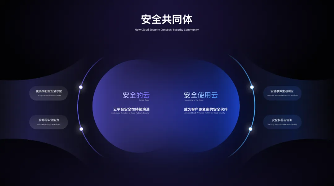 阿里云正式将公共云的安全责任共担思路,升级为“安全共同体”全新概念。在安全共同体理念的引导下,阿里云不仅提供安全的云服务,更要帮助客户安全地使用云。