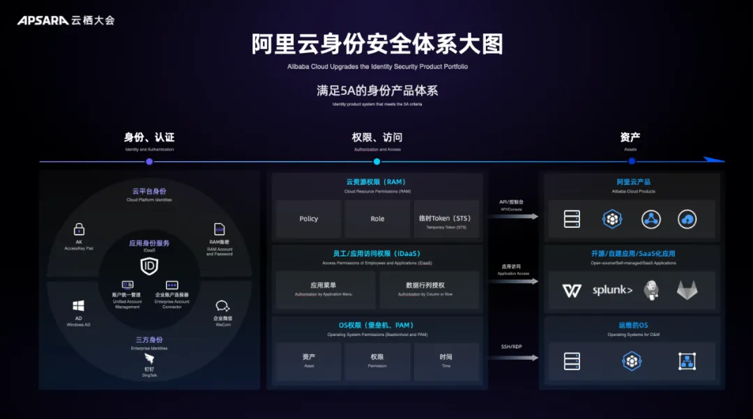 此次云栖大会上,阿里云发布了满足5A的身份产品体系大图,涵盖了从身份识别到权限分配的整个过程。