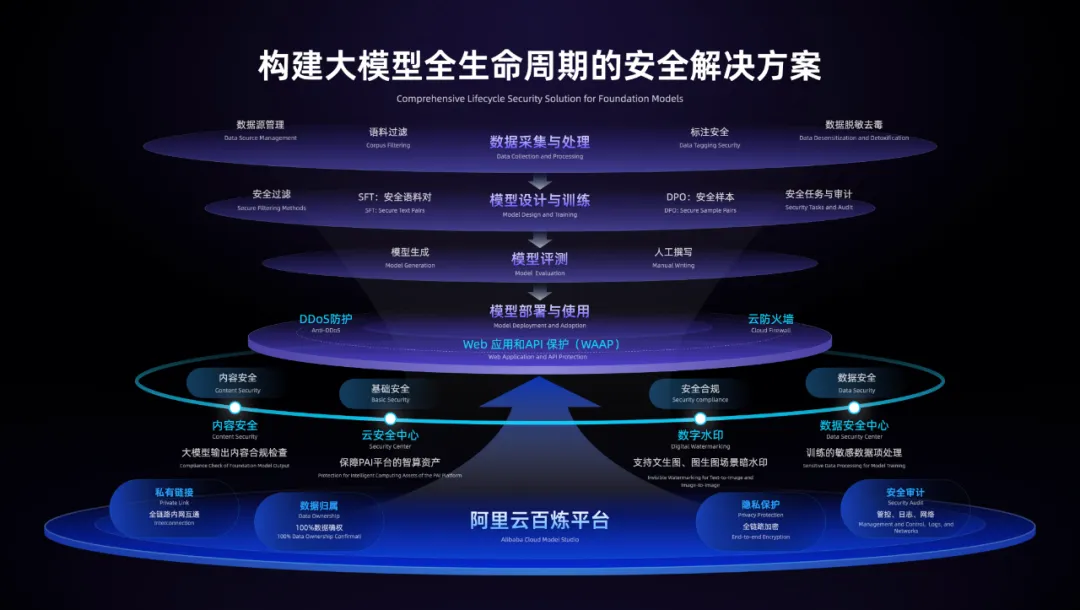 保护AI,阿里云升级了全新的大模型全生命周期的安全防护体系。在数据的采集、模型设计、训练、评测、部署和使用阶段都提供了丰富的安全产品,既包括在模型生成阶段的内容安全产品,以及云安全中心、WAAP产品、云防火墙、DDoS防护等保护AI基础设施的产品,也有数据安全中心、数字水印等数据安全产品。这些产品和技术能力不仅落实到阿里云自身的百炼平台和通义系列产品,也让客户同样可以便捷调用以保护自己的大模型全生命周期的安全。