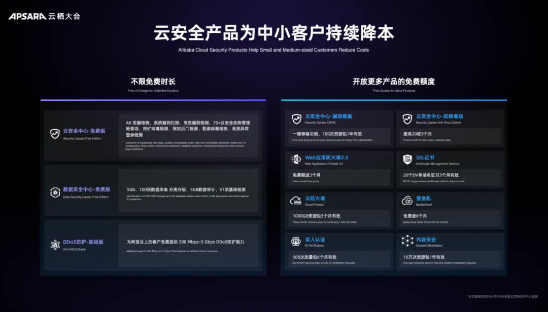 除了满足大型客户的需求,阿里云还致力于为中小客户提供更多的安全能力和服务,使他们在低成本的情况下也能有效保护自身的安全。做好平台安全建设的同时,阿里云也免费开放更多的安全能力额度,包括云安全中心、内容安全、数据安全中心,让中小企业客户能够增强安全防护,同时还在安全体验上增加一键检测、一键修复等功能,帮助客户共同加入到云上安全维护中。