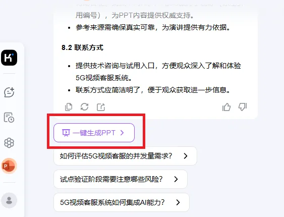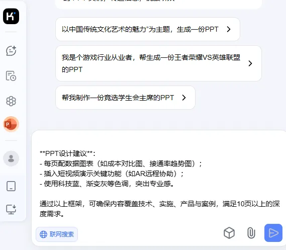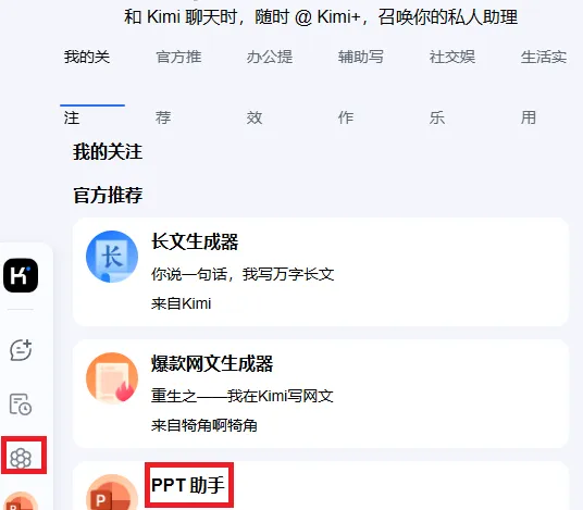第二步:打开Kimi,找到左侧工具栏,点击第4个图标,选择“PPT助手”。把DeepSeek生成的内容粘贴进去,等待输出完成,点击“一键生成PPT”,选择你喜欢的模板。