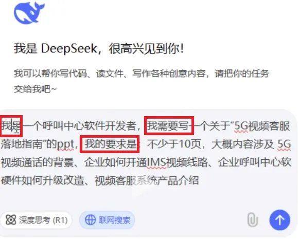 第一步:打开DeepSeek,输入你的PPT需求。告诉DeepSeek“我是谁,我需要什么,我的具体要求是什么”。可以参考我的提示词。然后直接复制它的答案。