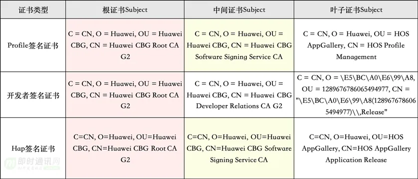 三者的根证书都一样,Profile签名证书和Hap签名证书的中间证书一样,三者的叶子证书均不一样。