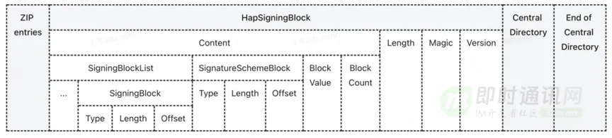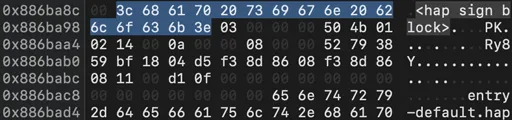 校验Hap包时首先在ZIP的Central Directory区前32个字节寻找是否有HapSigningBlock区的Header,找到以后定位到SignatureSchemeBlock区,解析其CMS格式,并校验SignatureSchemeBlock区证书链的完整性。