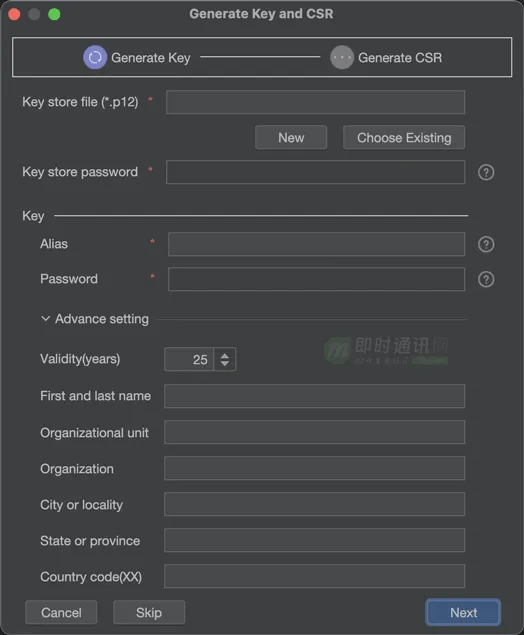 同样通过DevEco-Studio可以直接生成证书签名请求Certificate Signing Request(CSR)文件(操作步骤)。