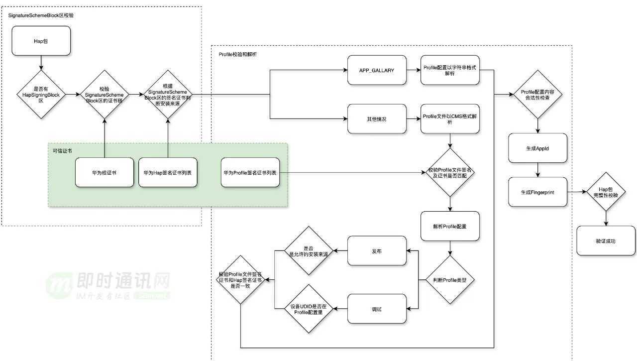 都校验通过后,再继续看Profile文件签名证书和Hap的签名正式是否相同,并继续对Profile配置的字段规则合法性进行检测。走完这一步,就可以认为Profile是可信的。