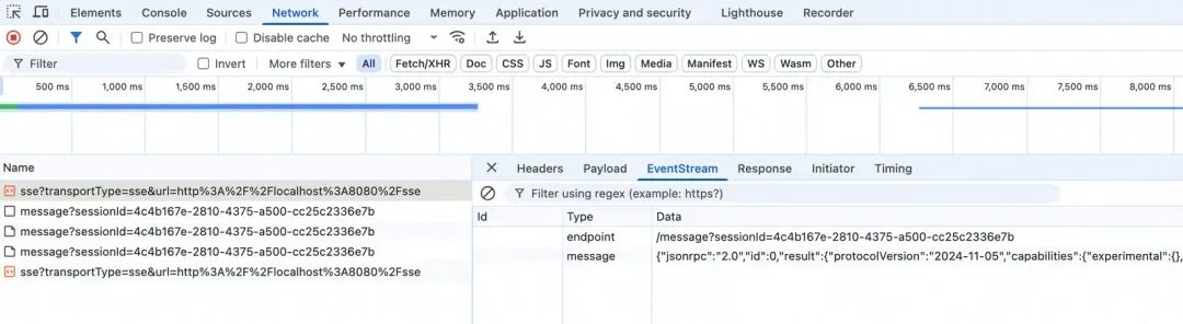 为了验证这个猜想,我还特地做一个实验,使用curl模拟了POST/messsage?sessionId=***发送一个请求包,果不其然在SSE的事件流中多了一条事件。