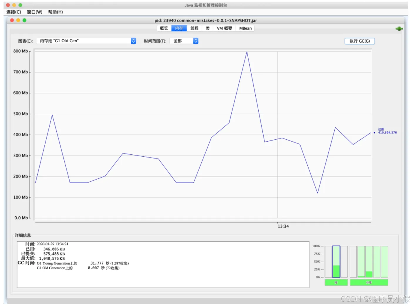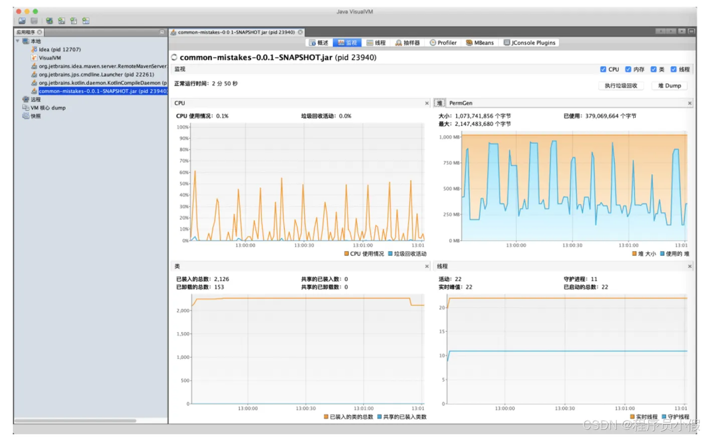继续观察监视面板可以看到,JVM 的 GC 活动基本是 10 秒发生一次,堆内存在 250MB 到 900MB 之间波动,活动线程数是 22。可以在监视面板看到 JVM 的基本情况,也可以直接在这里进行手动 GC 和堆 Dump 操作: