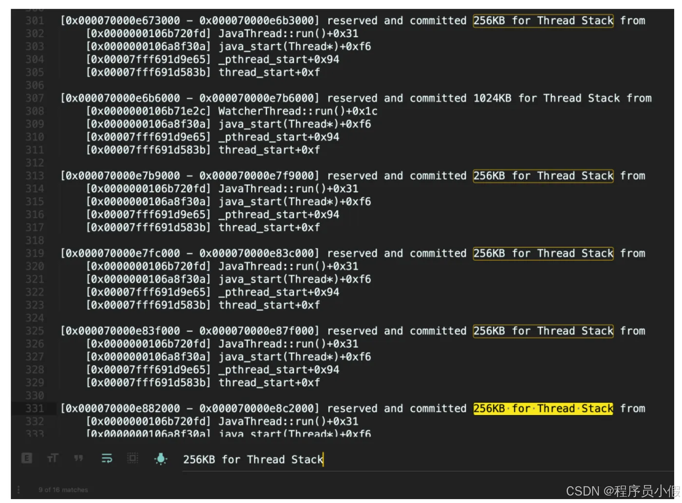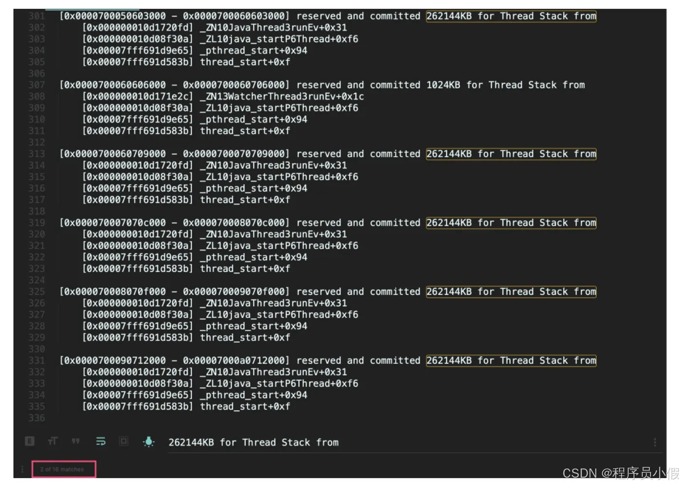 可以看到,有 16 个可疑线程,每一个线程保留了 262144KB 内存,也就是 256MB(通过下图红框可以看到,使用关键字 262144KB for Thread Stack from 搜索到了 16 个结果):