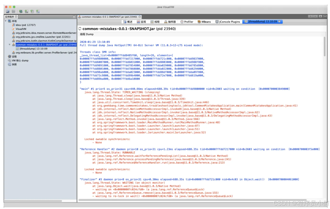 ➜ ~ jstack 23940 2020-01-29 13:08:15 Full thread dump Java HotSpot(TM) 64-Bit Server VM (11.0.3+12-LTS mixed mode): ... "main" #1 prio=5 os_prio=31 cpu=440.66ms elapsed=574.86s tid=0x00007ffdd9800000 nid=0x2803 waiting on condition [0x0000700003849000] java.lang.Thread.State: TIMED_WAITING (sleeping) at java.lang.Thread.sleep(java.base@11.0.3/Native Method) at java.lang.Thread.sleep(java.base@11.0.3/Thread.java:339) at java.util.concurrent.TimeUnit.sleep(java.base@11.0.3/TimeUnit.java:446) at org.geekbang.time.commonmistakes.troubleshootingtools.jdktool.CommonMistakesApplication.main(CommonMistakesApplication.java:41) at jdk.internal.reflect.NativeMethodAccessorImpl.invoke0(java.base@11.0.3/Native Method) at jdk.internal.reflect.NativeMethodAccessorImpl.invoke(java.base@11.0.3/NativeMethodAccessorImpl.java:62) at jdk.internal.reflect.DelegatingMethodAccessorImpl.invoke(java.base@11.0.3/DelegatingMethodAccessorImpl.java:43) at java.lang.reflect.Method.invoke(java.base@11.0.3/Method.java:566) at org.springframework.boot.loader.MainMethodRunner.run(MainMethodRunner.java:48) at org.springframework.boot.loader.Launcher.launch(Launcher.java:87) at org.springframework.boot.loader.Launcher.launch(Launcher.java:51) at org.springframework.boot.loader.JarLauncher.main(JarLauncher.java:52) "Thread-1" #13 prio=5 os_prio=31 cpu=17851.77ms elapsed=574.41s tid=0x00007ffdda029000 nid=0x9803 waiting on condition [0x000070000539d000] java.lang.Thread.State: TIMED_WAITING (sleeping) at java.lang.Thread.sleep(java.base@11.0.3/Native Method) at java.lang.Thread.sleep(java.base@11.0.3/Thread.java:339) at java.util.concurrent.TimeUnit.sleep(java.base@11.0.3/TimeUnit.java:446) at org.geekbang.time.commonmistakes.troubleshootingtools.jdktool.CommonMistakesApplication.lambda$null$1(CommonMistakesApplication.java:33) at org.geekbang.time.commonmistakes.troubleshootingtools.jdktool.CommonMistakesApplication$$Lambda$41/0x00000008000a8c40.run(Unknown Source) at java.lang.Thread.run(java.base@11.0.3/Thread.java:834) ...