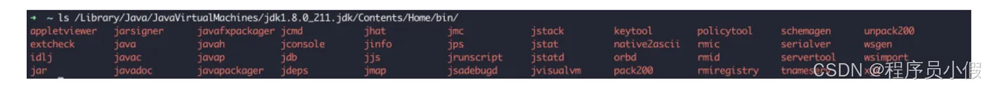 JDK 自带了很多命令行甚至是图形界面工具,帮助查看 JVM 的一些信息。比如,在机器上运行 ls 命令,可以看到 JDK 8 提供了非常多的工具或程序: