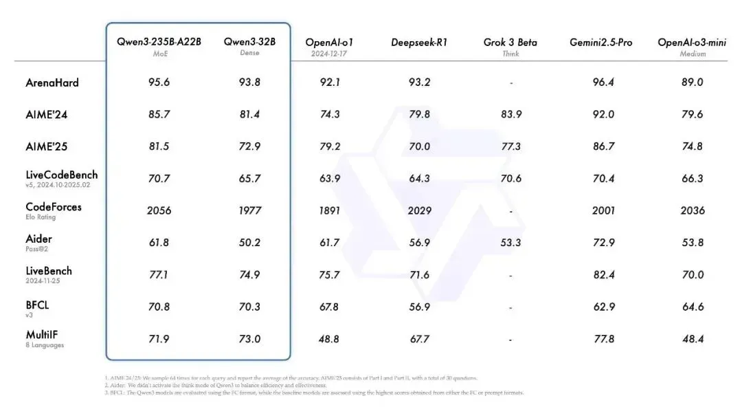 Qwen3 在推理、指令遵循、工具调用、多语言能力等方面均大幅增强。在官方的测评中,Qwen3 创下所有国产模型及全球开源模型的性能新高:在奥数水平的 AIME25 测评中,Qwen3 斩获 81.5 分,刷新开源纪录;在考察代码能力的 LiveCodeBench 评测中,Qwen3 突破 70 分大关,表现甚至超过 Grok3;在评估模型人类偏好对齐的 ArenaHard 测评中,Qwen3 以 95.6 分超越 OpenAI-o1 及 DeepSeek-R1。