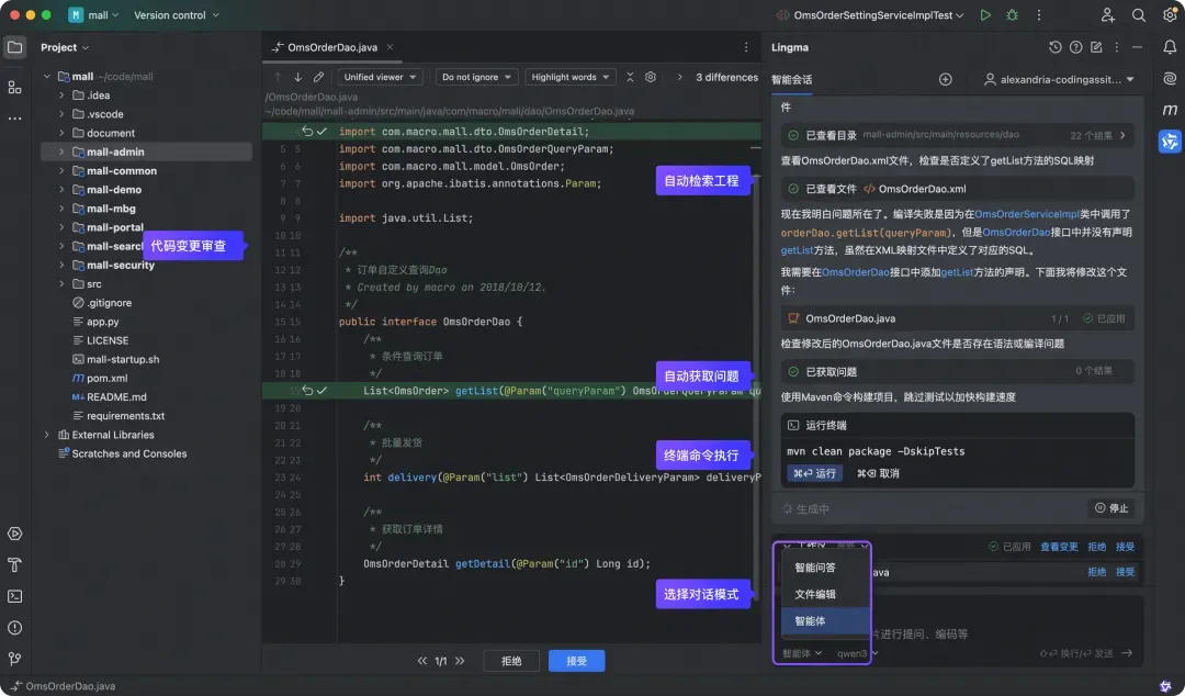 - 多种会话模式:一次会话流中同时支持问答模式、文件编辑模式、智能体模式,开发者可以针对不同场景和问题难度自由切换模式,实现工作效率最大化。