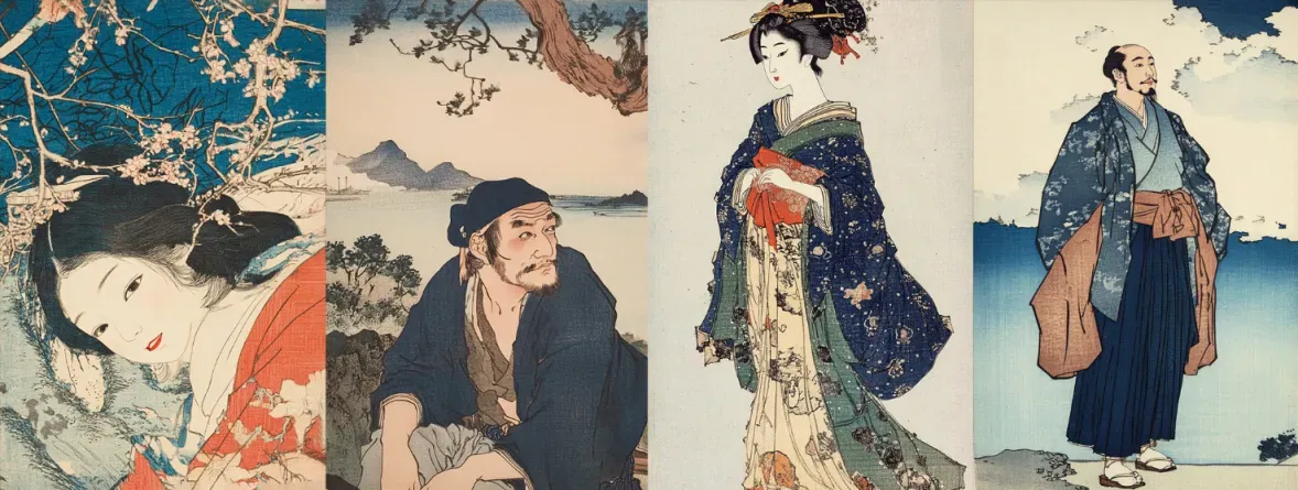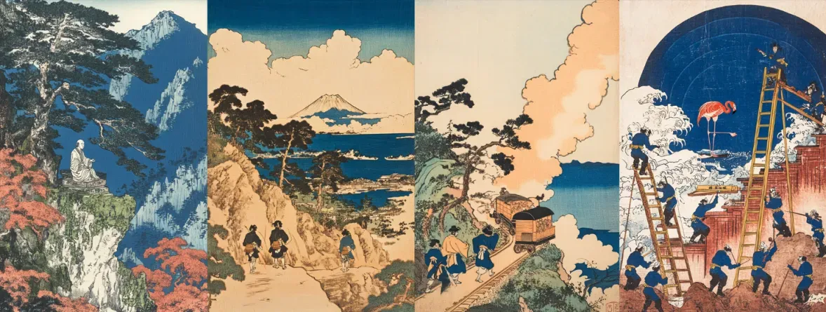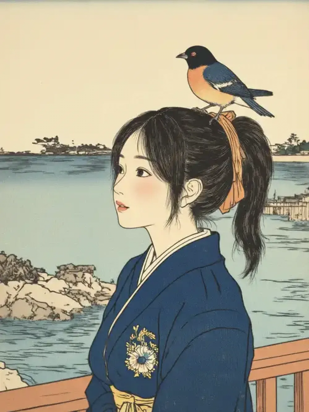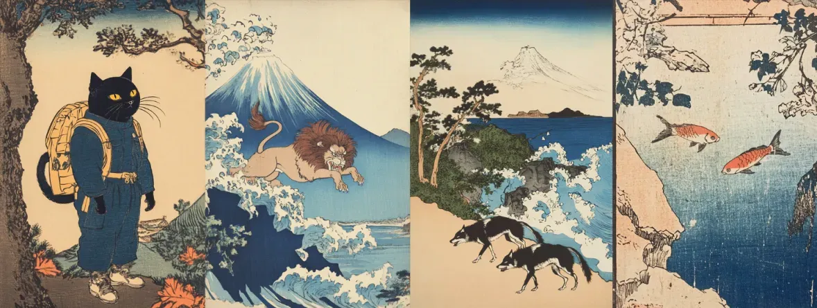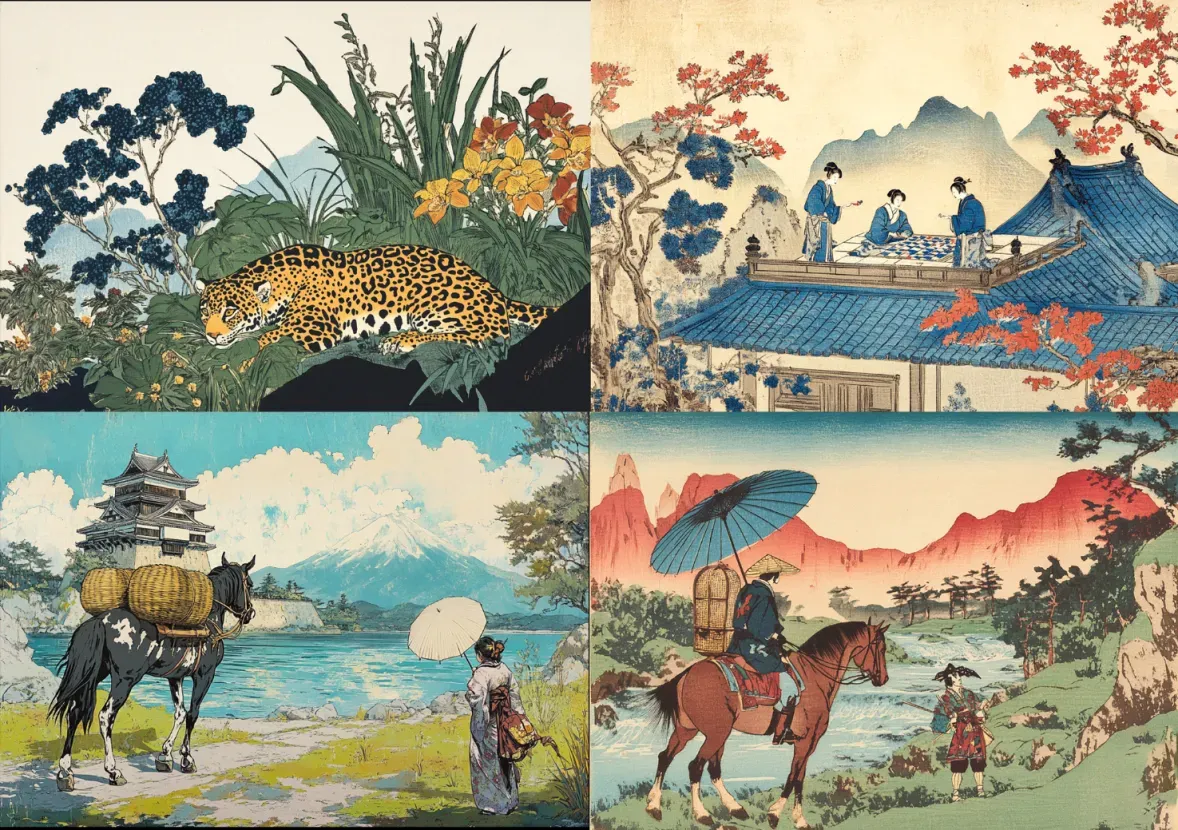 后来,我训练的模型更倾向于风格化,比如油画、浮世绘、抽象涂鸦等等。就拿这次获奖的灵犀共生的lora模型来讲,它是以浮世绘的平面装饰性构图与自然主题为基底,构建出独特的生态美学体系。模型通过解构葛饰北斋的浪纹笔触,在数字画布上重现山岳叠层、流水渐变等传统技法。该模型特别强化生物共生关系表现:仙鹤与老翁同匿田间、青蛙与淑女翩翩起舞、狗熊与大叔和平共处,鸟儿停在女孩头顶、兔子跑到姑娘脚下、小狗躺在女子怀里……充分体现万物互联理念,即一丹一世界。该模型突破传统浮世绘的静态叙事框架,使每幅作品既是独立画卷,又是持续演化的生态寓言。
