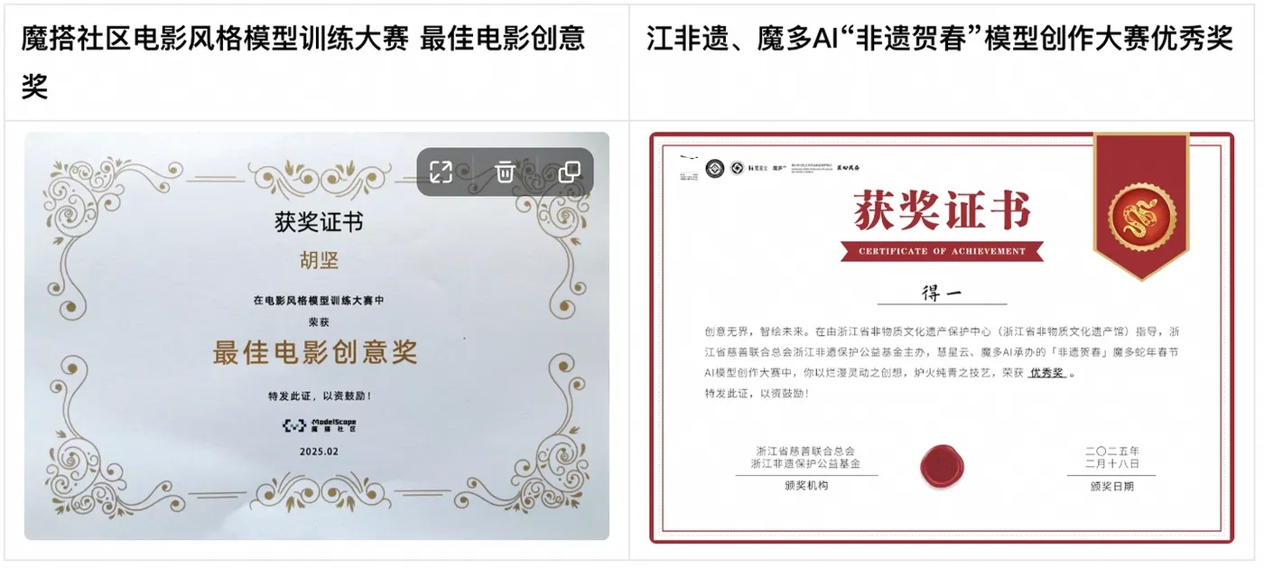 大家好我叫得一,是一名职业摄影师,也是一位专注于AIGC视觉领域的创作者。不论是摄影还是AI创作,我都旨在将自己理解的“真善美”用视觉的方式呈现出来。虽然接触AI已经两年多了,但我更多的时候是在学习与沉淀。魔搭活动的出现,对我来说是一个很好的契机,电影风格模型训练大赛是我参加的第一个活动,从那开始,我也陆续获得了一些奖项与肯定。