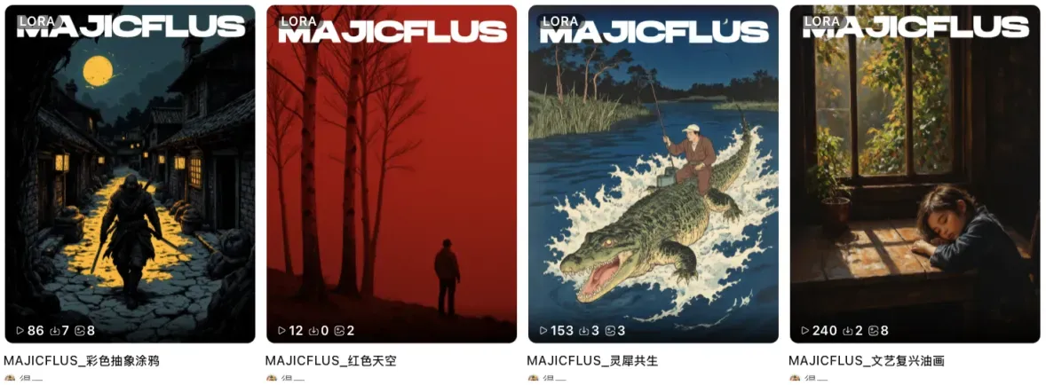 很荣幸我的lora模型灵犀共生获得了魔搭社区一丹一世界风格lora大赛的三等奖,感谢魔搭社区邀请我来分享这次训练模型的经验。其实,我训练模型起步算晚的,跳过了SD1.5和XL,直接从FLUX开始。一方面,FLUX模型的质感较之前的模型有了明显的提升,另一方面,魔搭社区的出现也让训练的便捷性大大地提高了。而在FLUX模型里,我最喜欢的是麦橘超然majicFlus这个大模型,后面自己训练的lora几乎也都是以此为底模。