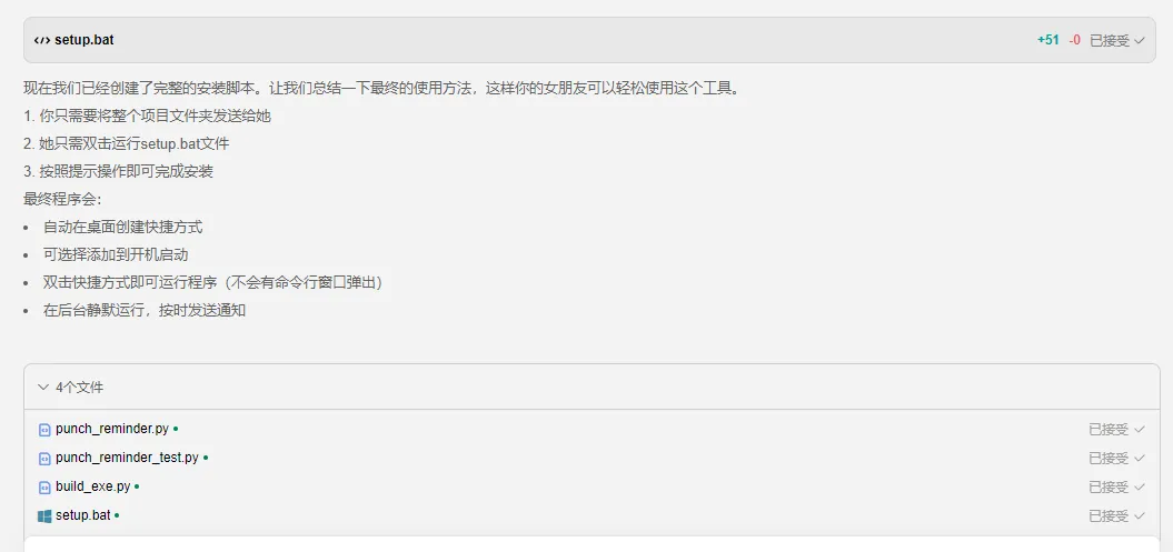 现在我们已经创建了完整的安装脚本。让我们总结一下最终的使用方法,这样你的女朋友可以轻松使用这个工具。 1. 你只需要将整个项目文件夹发送给她 2. 她只需双击运行setup.bat文件 3. 按照提示操作即可完成安装 最终程序会: 自动在桌面创建快捷方式 可选择添加到开机启动 双击快捷方式即可运行程序(不会有命令行窗口弹出) 在后台静默运行,按时发送通知 # 最终版打卡提醒助手使用指南 安装步骤(只需一次) 1. 将整个项目文件夹发送给你的女朋友 2. 让她双击运行文件夹中的 setup.bat 文件 3. 按照屏幕提示操作: 程序会自动安装所需组件 会在桌面创建快捷方式 可以选择添加到开机启动(推荐) 使用方法 1. 日常使用: 双击桌面上的"打卡提醒助手"快捷方式即可 程序会在后台运行,按时发送通知(不会有任何窗口弹出) 2. 开机自启动(如果安装时选择了Y): 无需任何操作,电脑开机后自动运行 3. 关闭程序: 在任务管理器中结束"PunchReminder.exe"进程 额外说明 1. 程序特性: 完全静默运行,不会干扰正常工作 只在工作日(周一至周五)提醒 默认提醒时间:上午9:00和下午18:00 2. 如需修改提醒时间: 你可以编辑 punch_reminder.py 文件中的时间设置 然后重新运行 setup.bat 更新程序 3. 文件说明: punch_reminder.py - 主程序源代码 punch_reminder_test.py - 测试程序 build_exe.py - 打包脚本 setup.bat - 一键安装脚本 现在你的女朋友只需简单双击就能使用这个贴心的打卡提醒工具了!