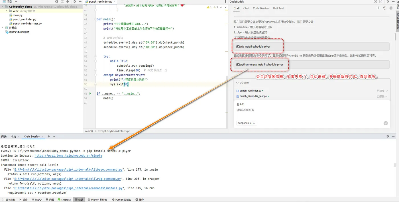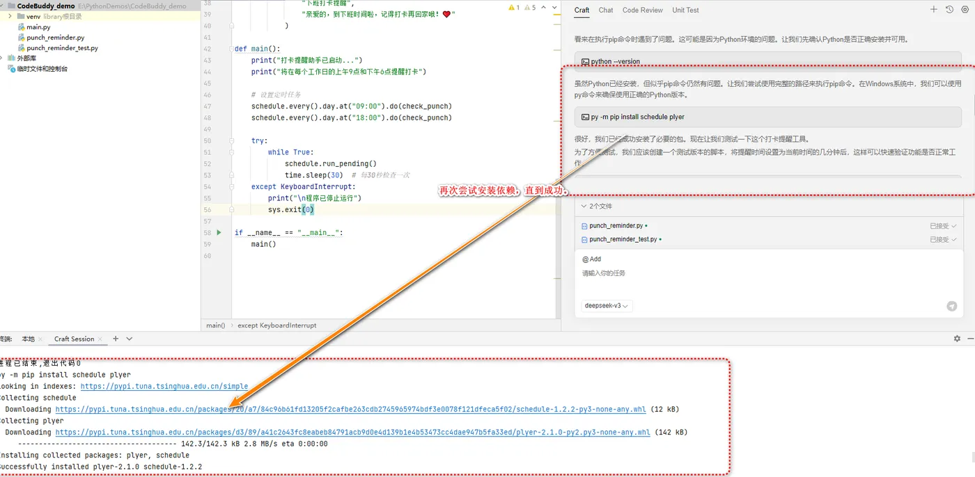 - 项目刚下好,依赖还没装?别担心,CodeBuddy会自动帮你安装脚本所需的一切依赖。 如果哪一步失败了,它不会暴脾气报错退出,而是默默重试、切换安装方式,直到你看到熟悉的“Success”字样。