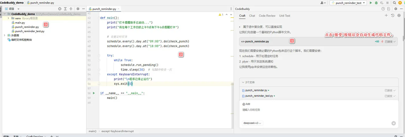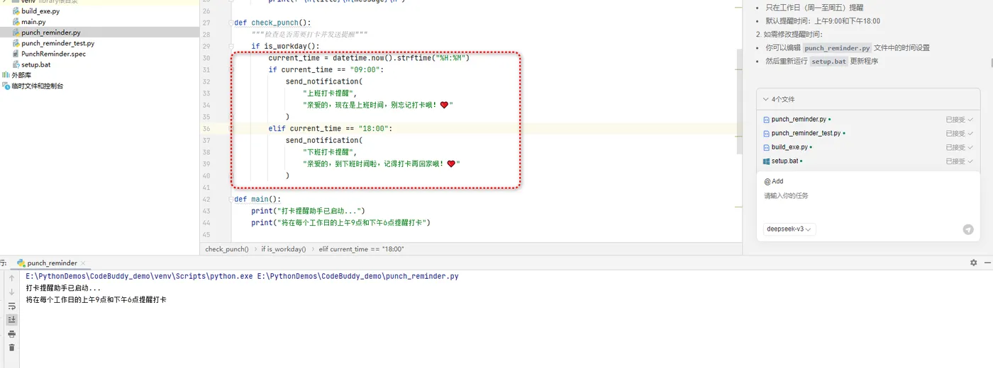 她总是——没错,就是总是——在上下班的关键时刻忘记打卡。于是我心中一动,灵感炸裂:“不如用Python给她做一个贴心的打卡提醒工具吧!”说干就干,我掏出了我的秘密武器——CodeBuddy。