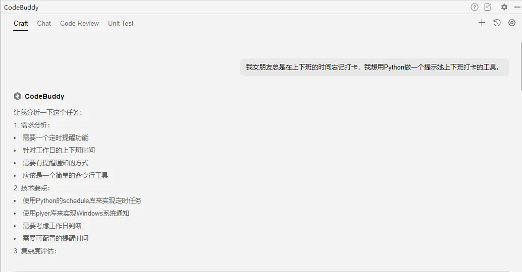 首先,发送一条指令:“我女朋友总是在上下班的时间忘记打卡,我想用Python做一个提示她上下班打卡的工具。”
