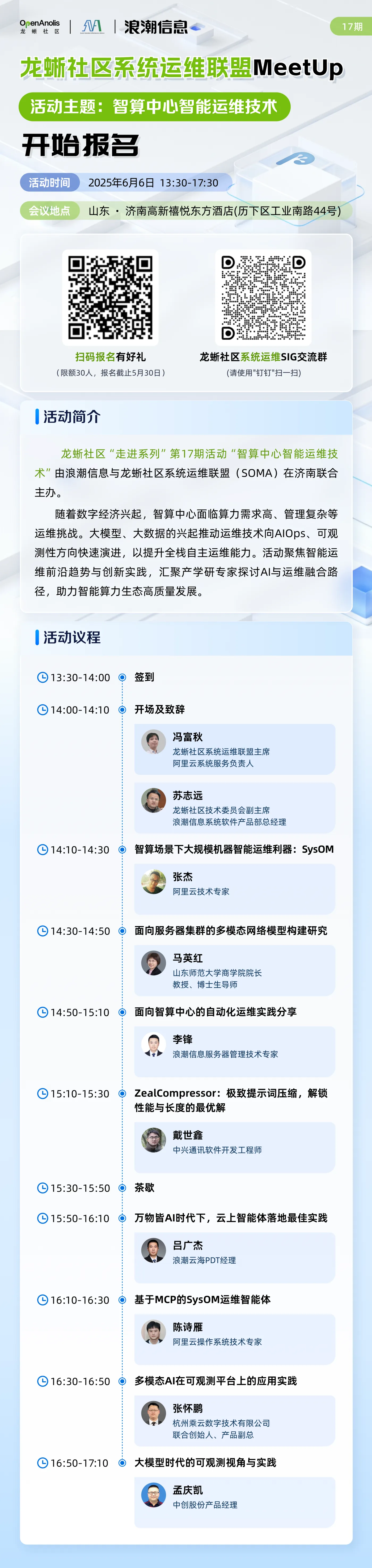 以「智算中心智能运维技术」为主题的龙蜥社区“走进系列”MeetUp 第 17 期,将于 6 月 6 日(周五)在山东·济南举办。本次活动由浪潮信息与龙蜥社区系统运维联盟(SOMA)联合主办,聚焦智算中心运维技术的前沿趋势与创新实践,汇聚产学研领域技术专家,围绕 AI 与运维技术的深度融合展开深度探讨。