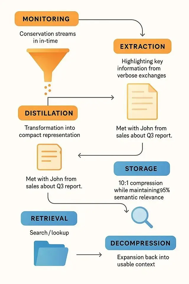 这里的工作已经超越了简单总结整个对话历史的粗糙压缩方法,使用一种更加精细的处理机制。当前的实现方案类似于专门为对话智能系统设计的编解码器(压缩-解压缩)算法,我们将这种技术称为记忆蒸馏。
