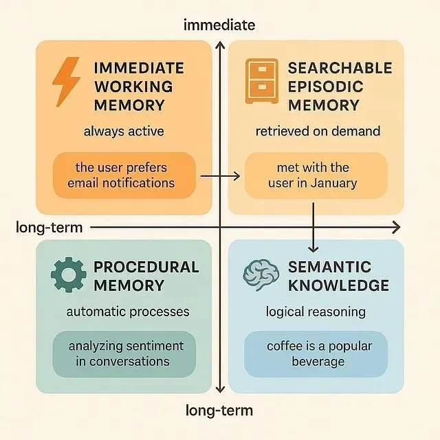 现代智能体系统需要构建更加精细化的记忆体系,这种体系应当反映人类认知科学中的记忆分类理论。根据认知心理学的研究成果,我们可以将智能体记忆系统划分为四个主要类别。