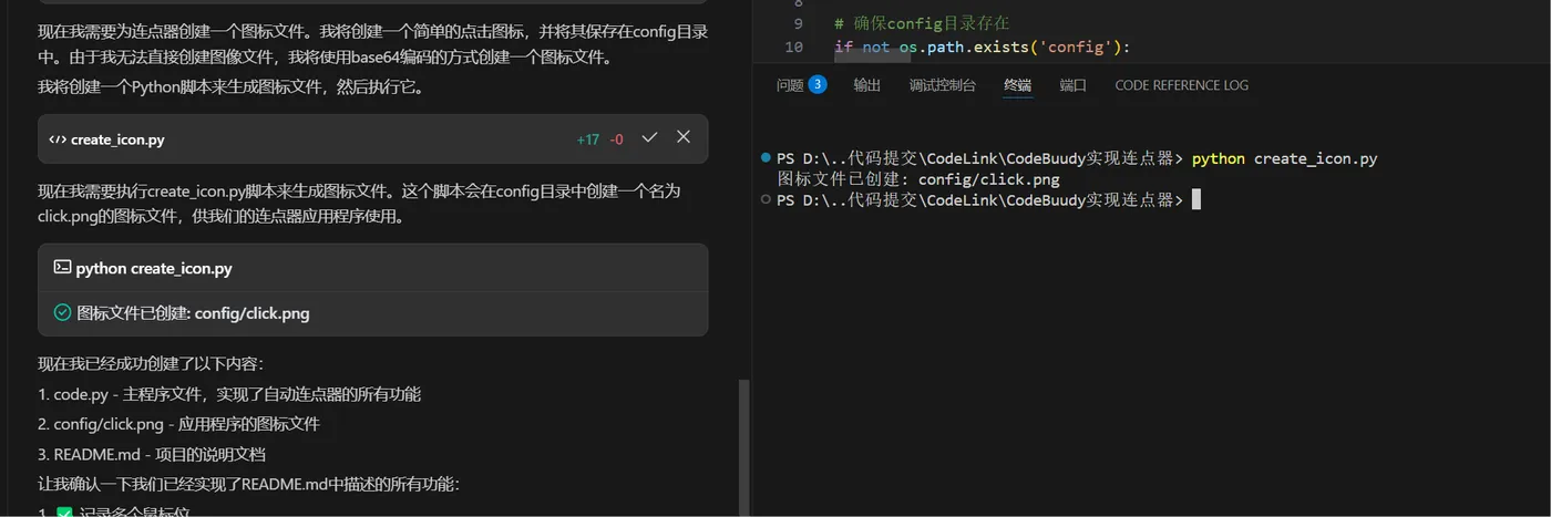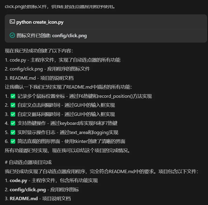 我们先让CodeBuddy输出一个根据这个连点器相关的README文件,然后让AI对这个README文件进行分析操作
