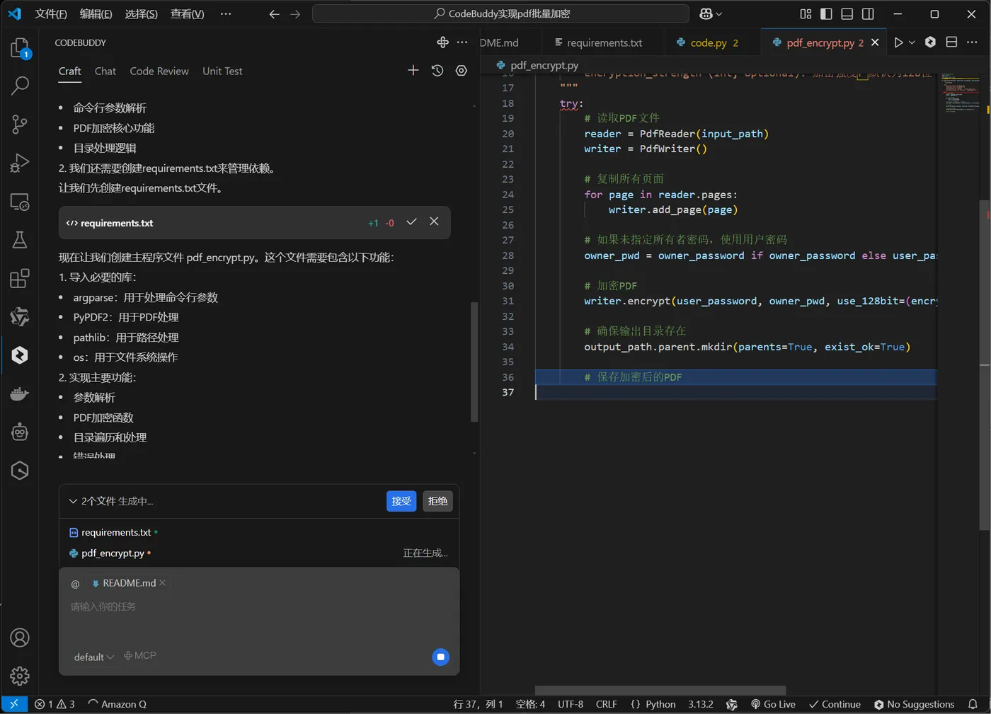CodeBuddy 作为一款高效的编程辅助工具,为解决 PDF 批量加密难题提供了新的思路和方法。CodeBuddy 具备强大的代码生成能力,能够根据用户需求,快速生成 Python、Java 等编程语言实现 PDF 批量加密的代码框架。以 Python 为例,结合 PyPDF2、pdfplumber 等库,通过 CodeBuddy 生成的代码,可以轻松实现对 PDF 文件的批量加密操作。用户只需简单输入相关参数,如文件路径、密码等,CodeBuddy 就能生成完整的代码逻辑,大大降低了编程门槛,即使是没有编程经验的用户,也能在 CodeBuddy 的帮助下,快速上手实现 PDF 批量加密功能。