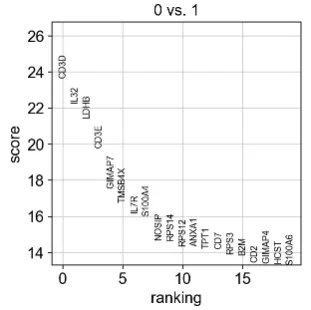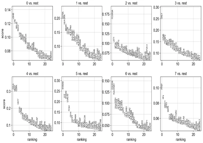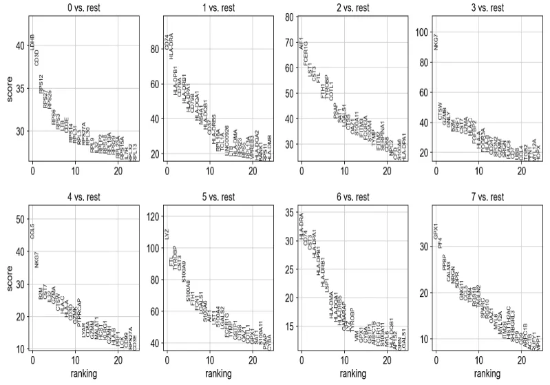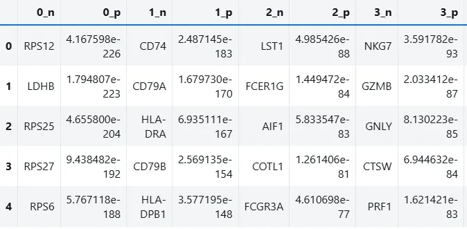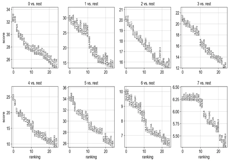 来给每个细胞簇里差异表达明显的基因排个序。通常情况下,要是 AnnData的.raw 属性已经提前设置好了,就会拿它来用。最便捷快速的方式就是做 t 检验。
