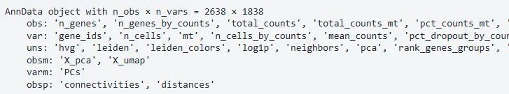 如果你想把文件分享给那些只打算用来做可视化的小伙伴,可以通过删除密集的缩放和校正数据矩阵来减小文件大小。不过别担心,文件里还是有 adata.raw 里用于可视化的原始数据的。