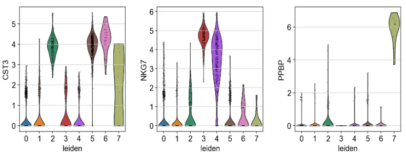 要是想仔细看看某个特定组的情况,可以用 sc.pl.rank_genes_groups_violin。