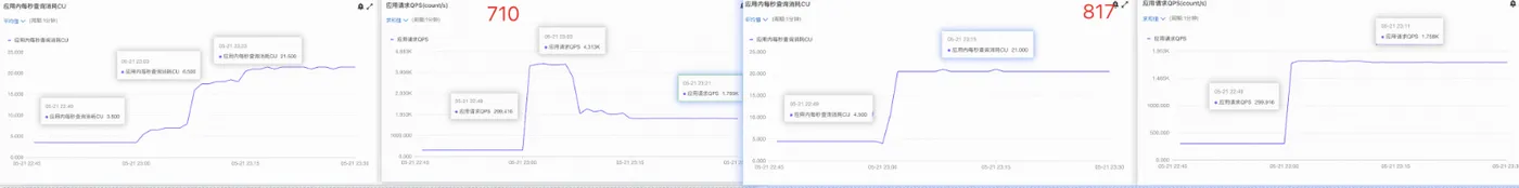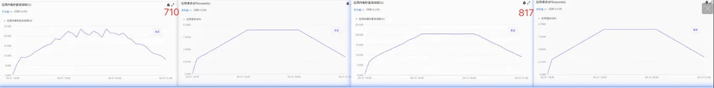 - 在 CU 统计上,8.17 应用更线性更稳定;7.10 应用在初期弹性和高峰期会有波动。具体可见:消耗CU、应用请求QPS、总请求数统计图表。