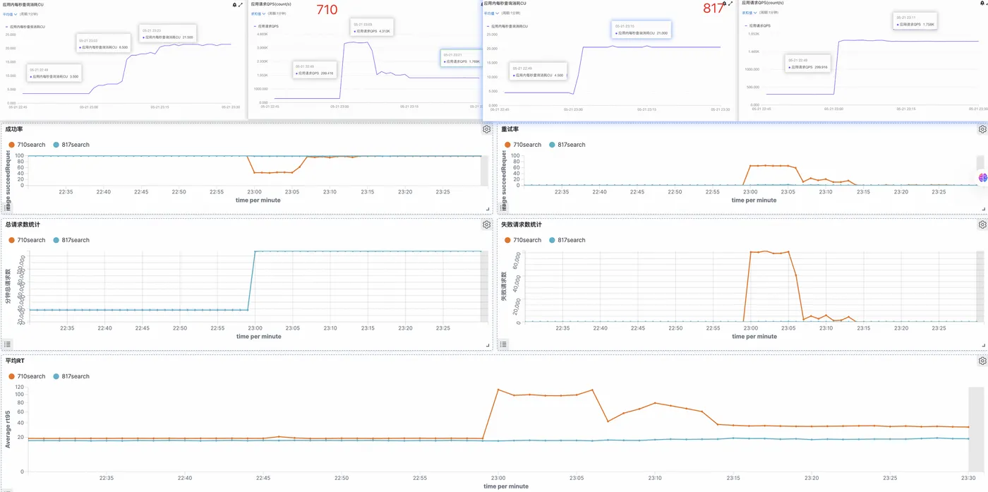 - B场景-流量瞬时突增:8.17版能够稳定承接流量突增,而7.10版需要一定时间缓冲,初期成功率较低。8.17版在整体RT平稳度、稳定性与无感扩容体验上更优。