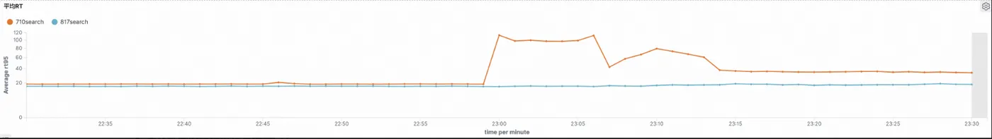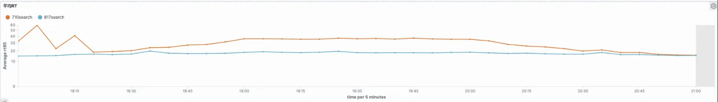 - 8.17 应用较 7.10 应用在整体 RT 平稳度、RT 耗时上都更有优势,可见流量增长过程中 8.17 的 RT/took 都很稳定。具体可见:平均RT统计图表。