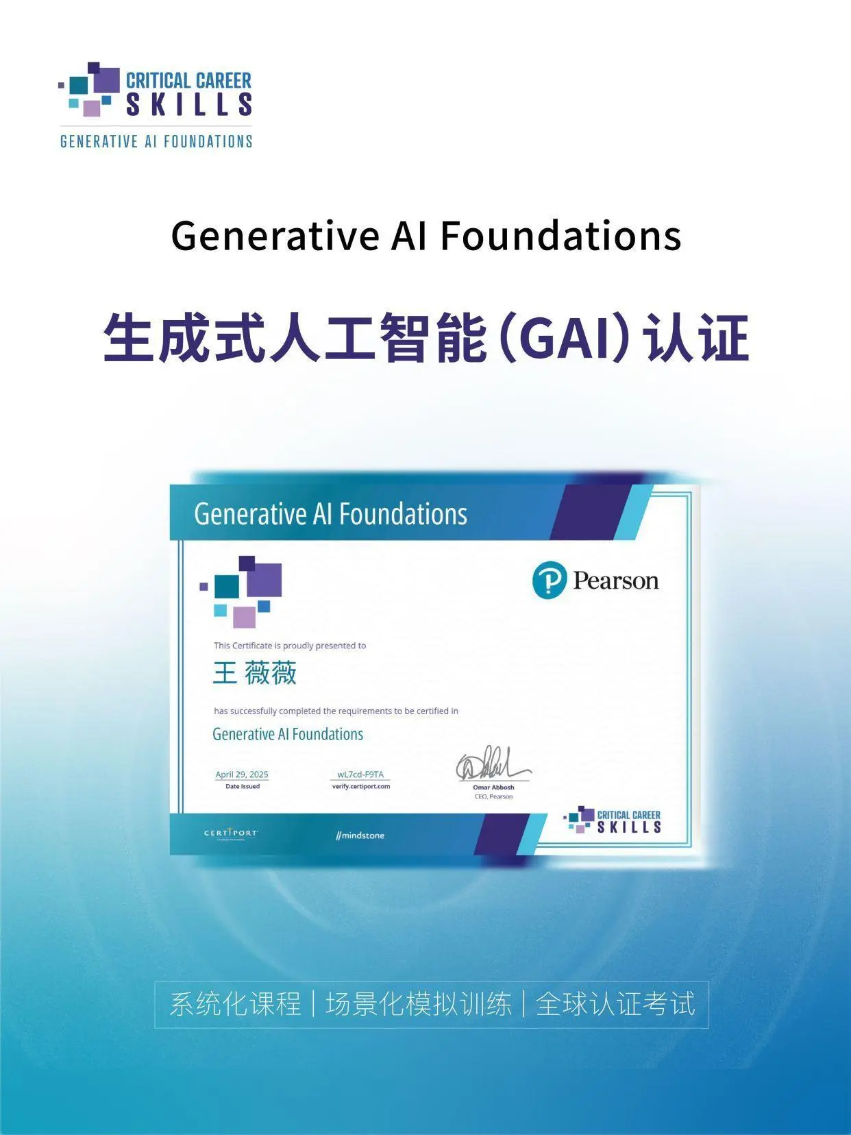生成式人工智能认证(GAI认证)由全球知名的培生旗下Certiport推出,是衡量你在生成式人工智能领域专业知识和技能的标准。无论你是希望在职场中晋升,还是想增加求职竞争力,生成式人工智能认证(GAI认证)都能为你提供有力支持。