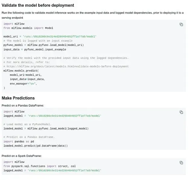 在完成带有签名和输入示例的模型记录后,我们可以直接使用 MLFlow 的内置工具对模型进行验证,无需重新加载训练代码或重建处理流程。