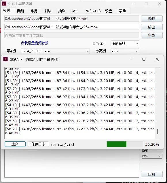 完成视频导入和参数设置后,点击软件界面下方的“压制”按钮,小丸视频压缩工具将开始对视频进行压缩处理。在压制过程中,界面会显示进度条、处理速度、剩余时间等信息,方便用户了解任务进度。