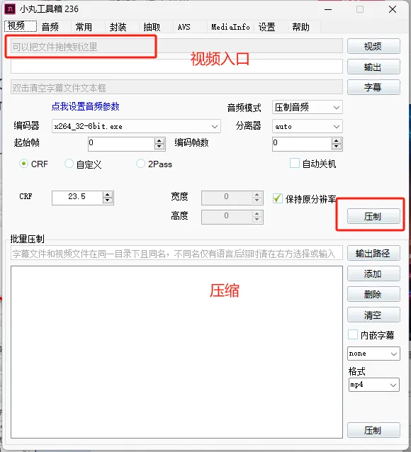 - 打开小丸工具箱软件,进入主界面。选择导入视频或拖拽视频到下图区域中,导入后选择压缩,见下图: