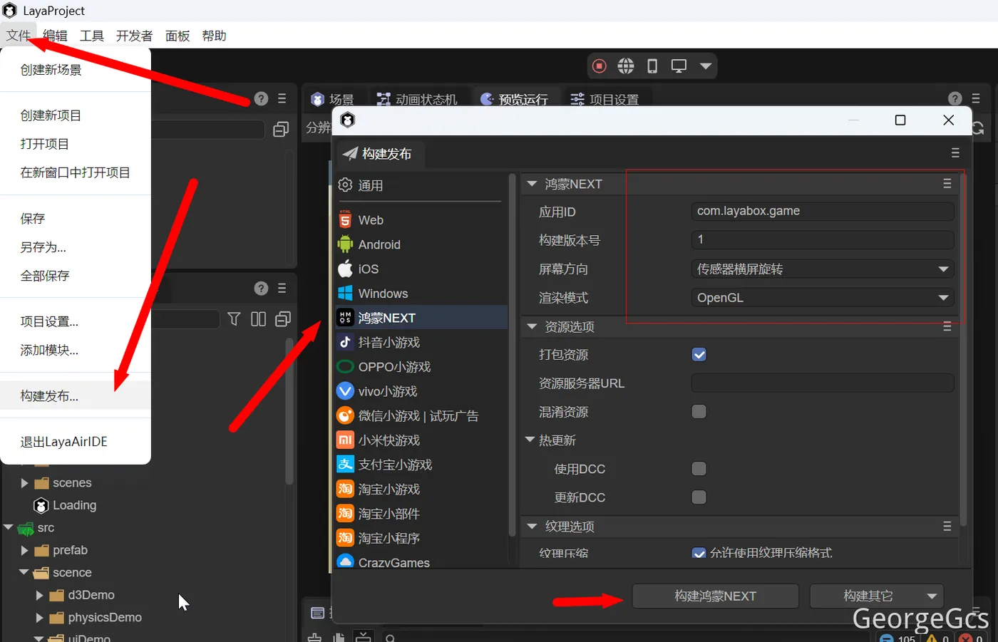 进度条完成后,如上图所示,会出现鸿蒙项目代码,点击箭头位置就可以到源码项目处。再使用DevEco Studio进行鸿蒙项目自动签名,运行就可运行Laya小游戏。