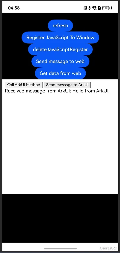 Column() { // 显示网页返回数据 Text(`Web返回数据:${this.webResult}`).fontSize(16).margin(10); // 1. 注册ArkUI对象到网页 Button('注册到Window') .onClick(() => { this.controller.registerJavaScriptProxy( this.testObj, // ArkUI对象 this.regName, // 网页访问名称 ["test", "toString", "receiveMessageFromWeb"] // 允许调用的方法白名单 ); }) // 2. ArkUI调用网页JS Button('调用网页函数') .onClick(() => { this.controller.runJavaScript( 'webFunction("Hello from ArkUI!")', // 执行网页JS代码 (error, result) => { // 回调处理返回值 if (!error) this.webResult = result || '无返回值'; } ); }) // 3. Web组件加载 Web({ src: $rawfile('index.html'), controller: this.controller }) .javaScriptAccess(true) // 开启JS交互权限 .onPageEnd(() => { // 页面加载完成时触发 // 页面加载后自动调用网页测试函数 this.controller.runJavaScript('initWebData()'); }) }