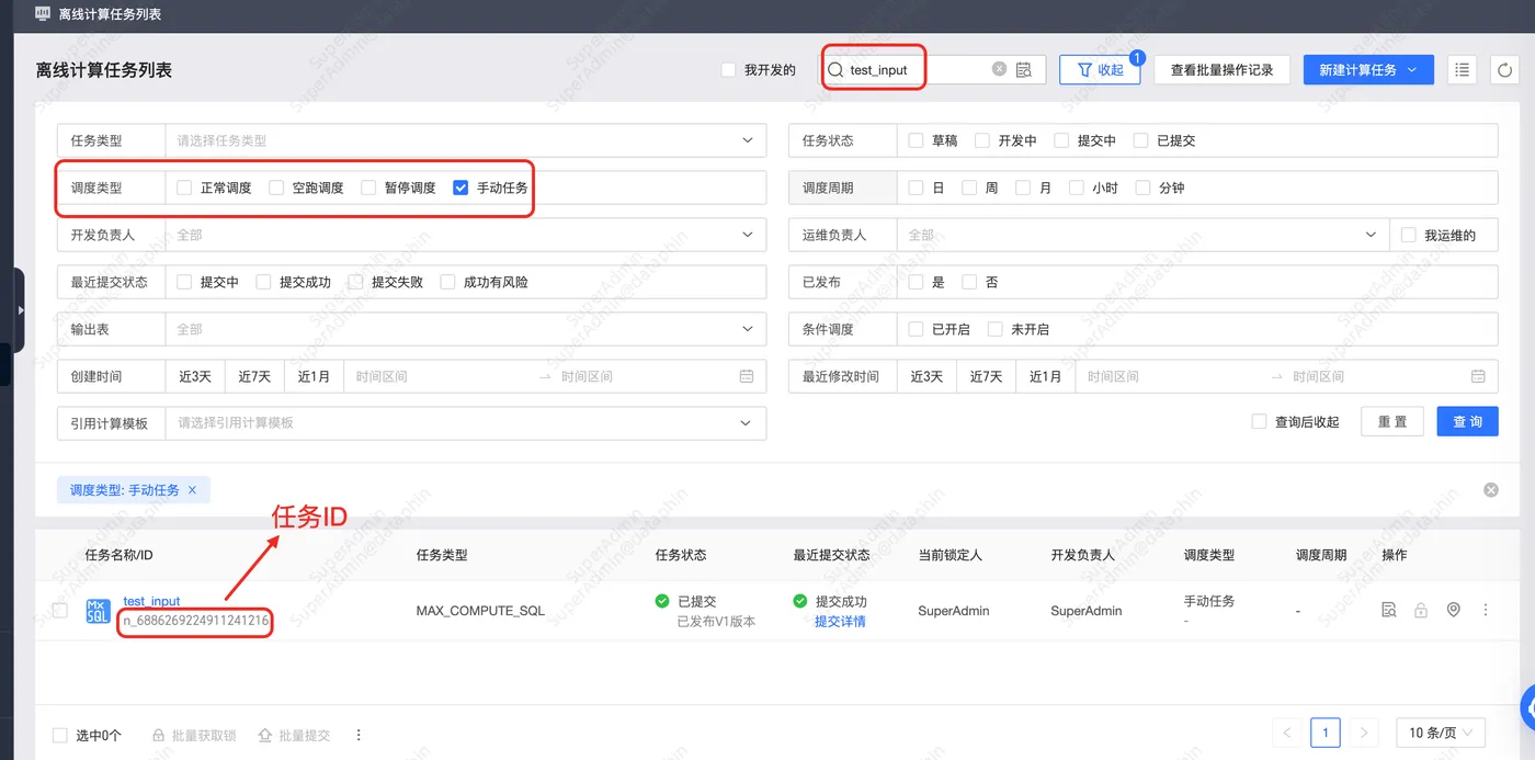 - 在计算任务列表中可以通过搜索和筛选查询到符合要求的任务,可以获取当前任务的ID,即节点ID(node_id)。