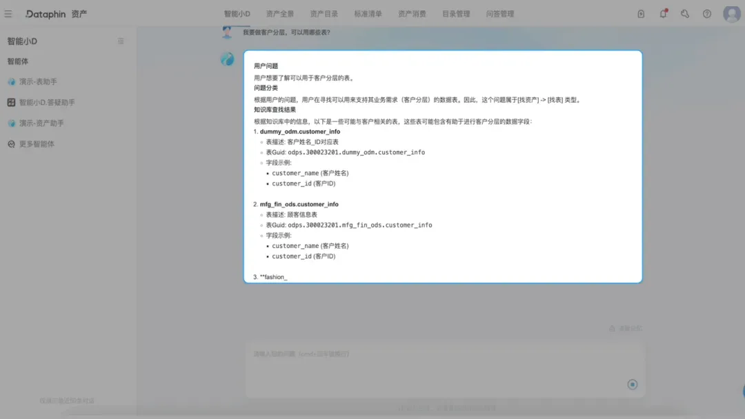 在智能找表场景,Dataphin有效解决了用户将复杂业务问题,转化为准确搜索词的难题。“引入AI后,你可以用业务的语言直接问,比如‘我要做客户分层’,‘我要用哪张表’,AI会用大模型去对业务问题进行拆解和泛化,最后找关联到你已有的全域资产”。