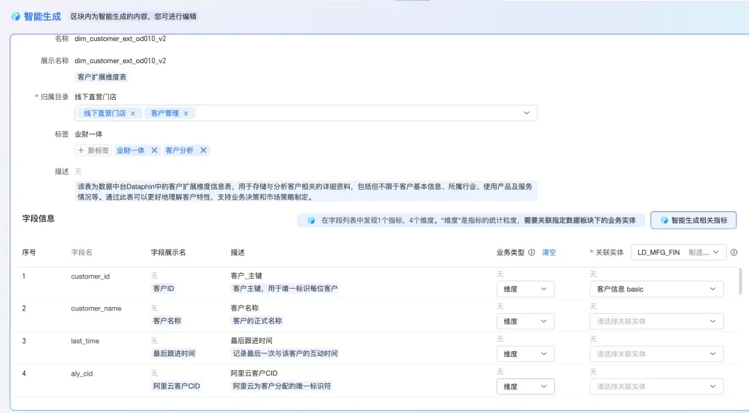 在数据管家场景,资产上架往往涉及表描述、字段注释、目录归属、标签分类等复杂操作,尤其在字段数量众多时,人工维护工作量大、耗时长且易出错。通过引入 AI 能力,Dataphin支持属性信息的智能生成,可一键生成表/字段描述信息、目录、标签等,使人力成本与操作门槛大大降低。