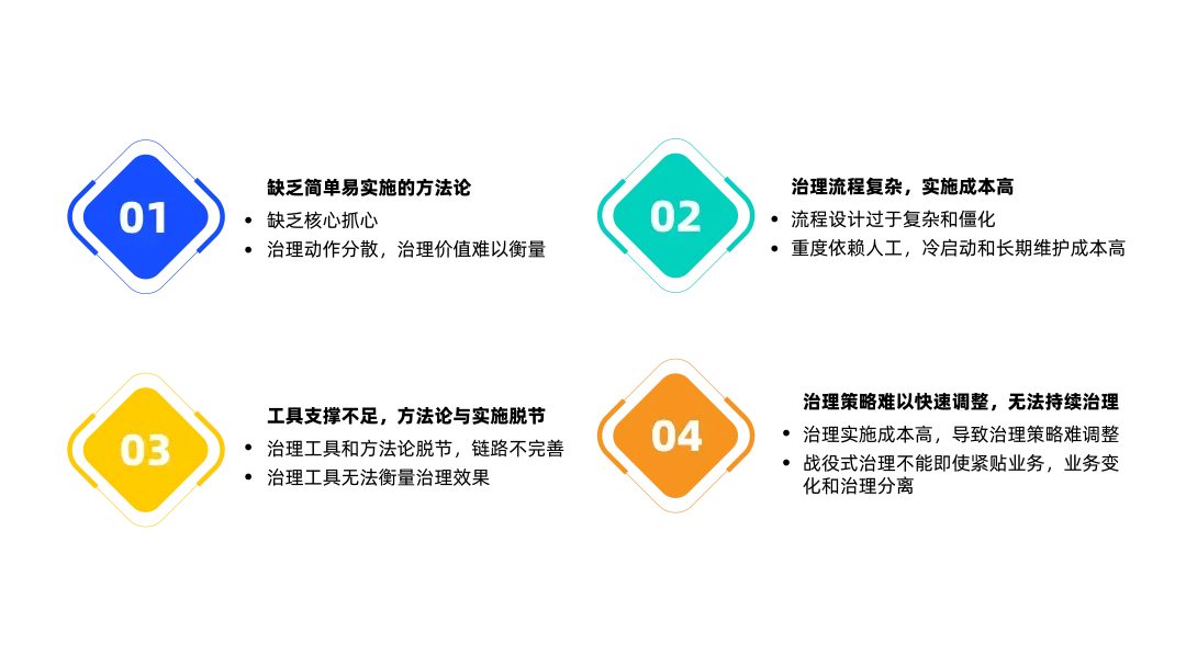 但在现实情况中,许多数据治理的结果通常会面临失败,周鑫将其归结为四个原因:1)治理动作分散,缺乏体系化方法论;2)治理流程复杂,重度依赖人的能力和素质;3)缺乏工具支撑,导致理论与实施脱节;4)无法持续治理,治理策略难以快速调整。