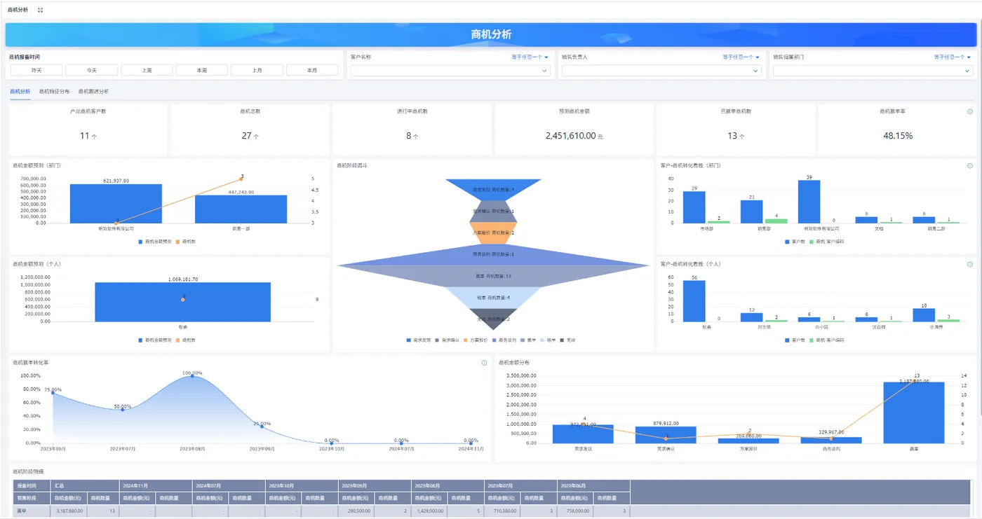 - 商机评估:对商机的潜力进行评估,包括商机的价值、进展阶段等。