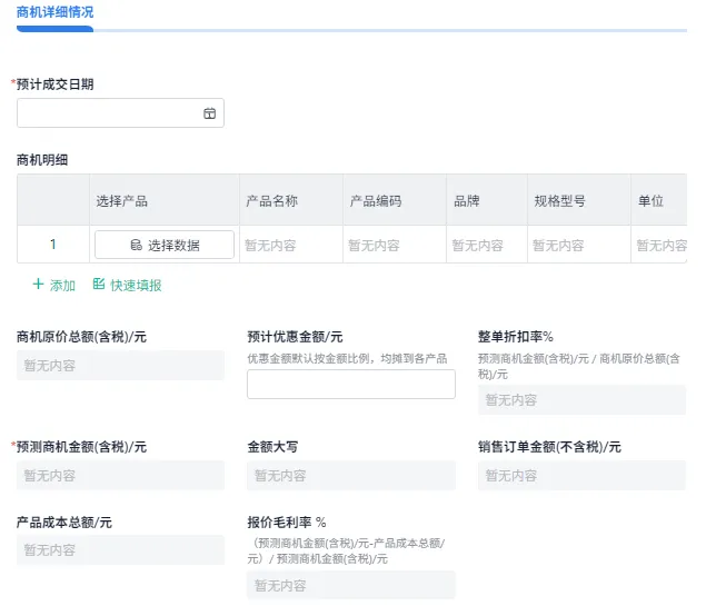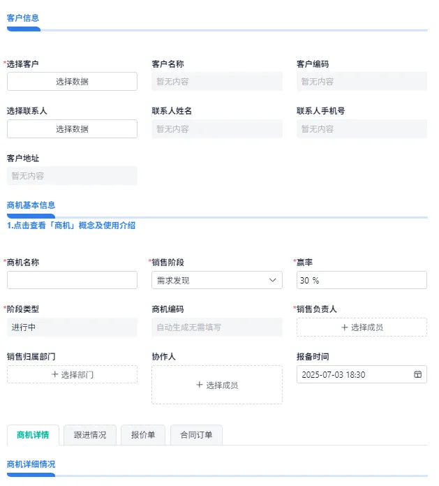- 商机创建与记录:销售人员可以创建新商机,并记录商机相关信息,如客户需求、预期成交时间等。