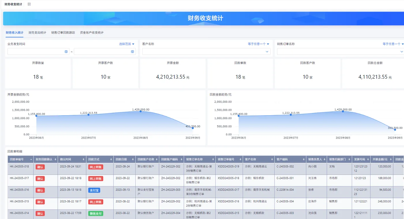 通过CRM系统中的财务管理板块,企业能够高效地处理销售订单的开票申请、回款记录等。系统会自动生成开票申请单编号、回款单编号,确保财务数据的准确性。此外,财务人员还可以通过系统查看各个订单的开票和回款进度,进一步提高了工作效率。