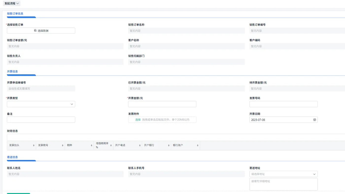 - 开票申请:根据销售订单生成开票申请,记录发票信息、财务信息、寄送信息等。
