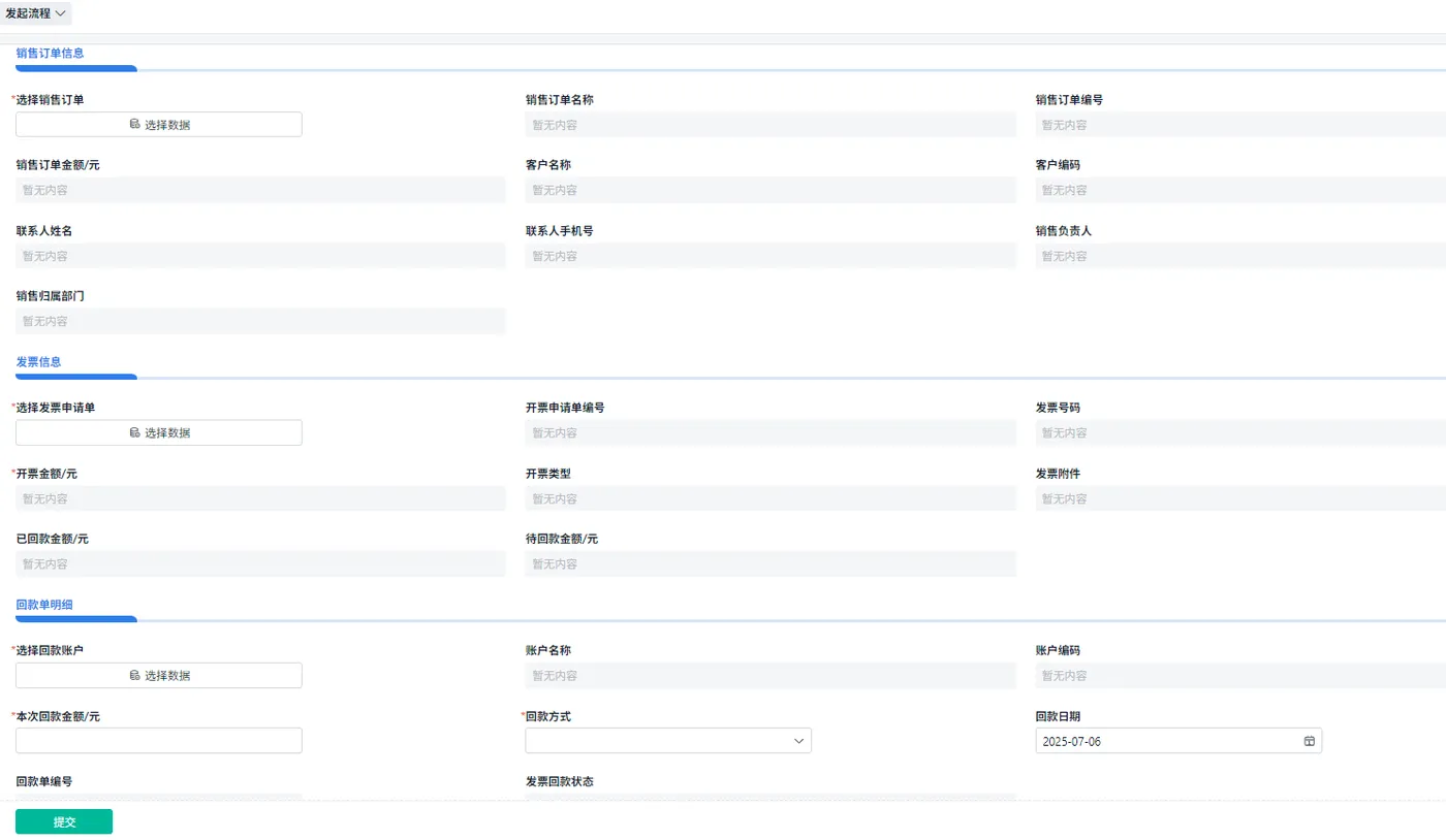 - 回款单明细: 回款账户(选择数据) 本次回款金额、回款方式(如银行转账、现金支付等) 回款日期(如2025-07-06) 回款单编号(系统自动生成)